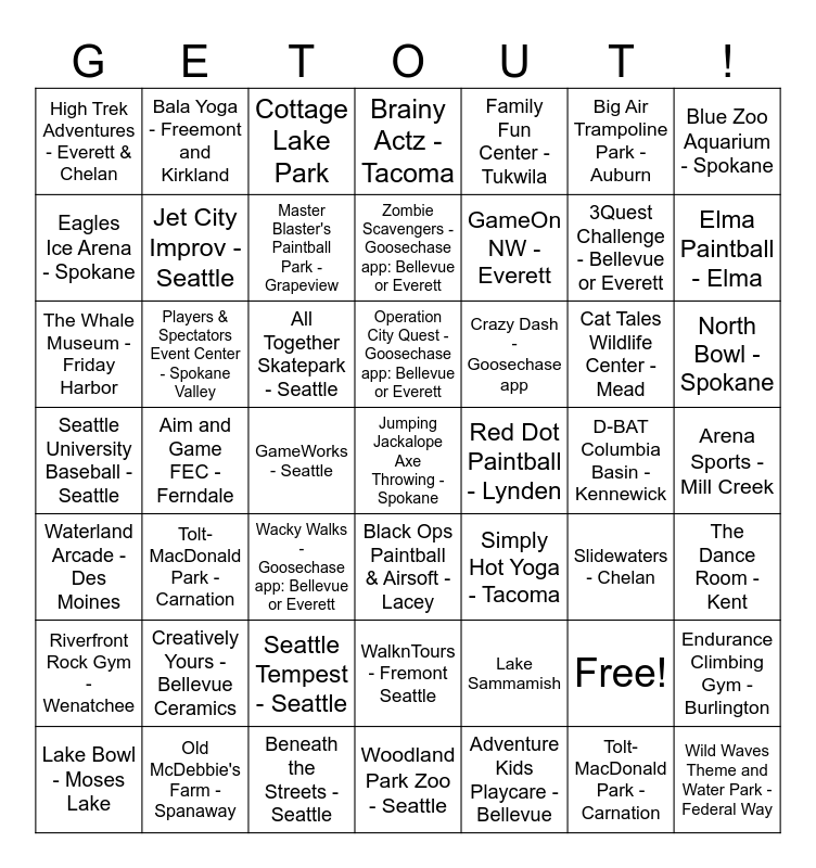 This bingo card has a free space and 49 words: Free!, 3Quest Challenge - Bellevue or Everett, Adventure Kids Playcare - Bellevue, Aim and Game FEC - Ferndale, All Together Skatepark - Seattle, Arena Sports - Mill Creek, Bala Yoga - Freemont and Kirkland, Beneath the Streets - Seattle, Big Air Trampoline Park - Auburn, Black Ops Paintball & Airsoft - Lacey, Blue Zoo Aquarium - Spokane, Brainy Actz - Tacoma, Cat Tales Wildlife Center - Mead, Crazy Dash - Goosechase app, Creatively Yours -Bellevue Ceramics, D-BAT Columbia Basin - Kennewick, Eagles Ice Arena - Spokane, Elma Paintball - Elma, Endurance Climbing Gym - Burlington, Family Fun Center - Tukwila, GameOn NW - Everett, GameWorks - Seattle, High Trek Adventures - Everett & Chelan, Jet City Improv - Seattle, Lake Bowl - Moses Lake, Master Blaster's Paintball Park - Grapeview, North Bowl - Spokane, Old McDebbie's Farm - Spanaway, Operation City Quest - Goosechase app: Bellevue or Everett, Players & Spectators Event Center - Spokane Valley, Puetz Golf - Seattle, Red Dot Paintball - Lynden, Riverfront Rock Gym - Wenatchee, Seattle Tempest - Seattle, Seattle University Baseball - Seattle, Simply Hot Yoga - Tacoma, Slidewaters - Chelan, The Dance Room - Kent, The Whale Museum - Friday Harbor, Wacky Walks - Goosechase app: Bellevue or Everett, WalknTours - Fremont Seattle, Waterland Arcade - Des Moines, Wild Waves Theme and Water Park - Federal Way, Woodland Park Zoo - Seattle, Zombie Scavengers - Goosechase app: Bellevue or Everett, Cottage Lake Park, Lake Sammamish, Tolt-MacDonald Park - Carnation and Tolt-MacDonald Park - Carnation.