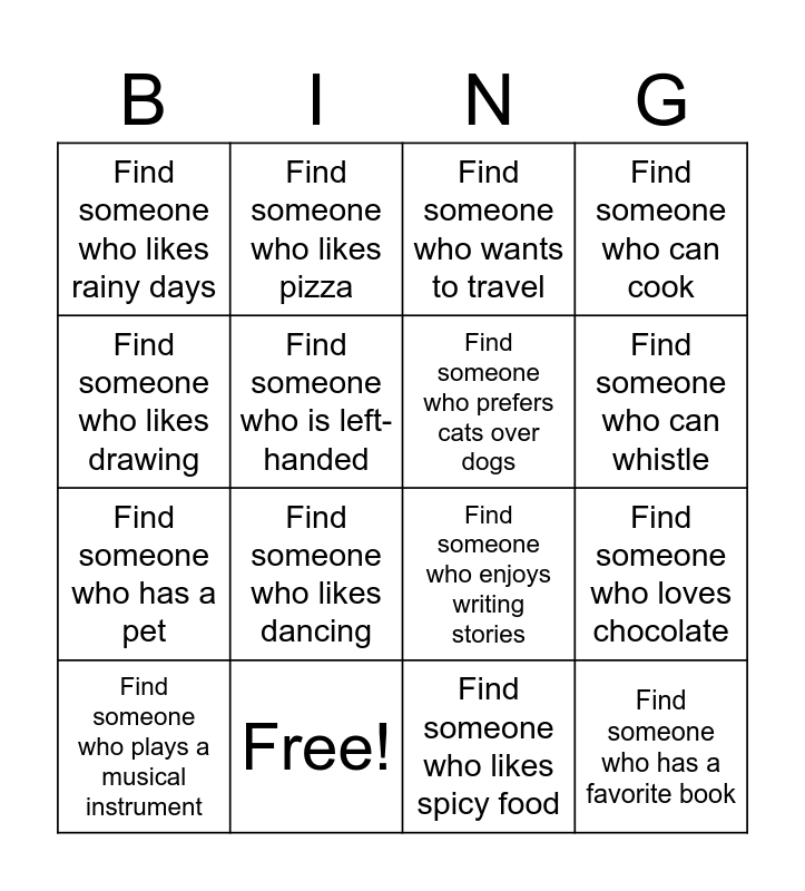 This bingo card has 16 words: Free!, Find someone who loves chocolate, Find someone who wants to travel, Find someone who likes rainy days, Find someone who has a pet, Find someone who likes pizza, Find someone who enjoys writing stories, Find someone who likes spicy food, Find someone who likes drawing, Find someone who is left-handed, Find someone who plays a musical instrument, Find someone who can cook, Find someone who likes dancing, Find someone who can whistle, Find someone who prefers cats over dogs and Find someone who has a favorite book.