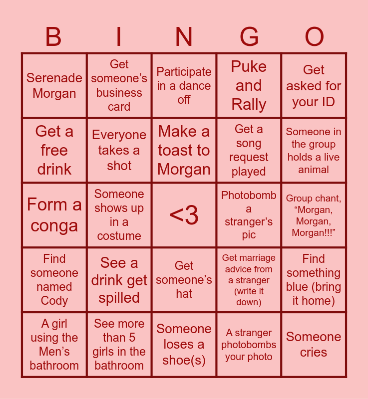 This bingo card has a free space and 24 words: See a drink get spilled, See more than 5 girls in the bathroom, Make a toast to Morgan, A girl using the Men’s bathroom, Get asked for your ID, Serenade Morgan, Get a free drink, Get someone’s business card, Photobomb a stranger’s pic, Get someone’s hat, Get a song request played, Form a conga, Get marriage advice from a stranger (write it down), Find something blue (bring it home), Everyone takes a shot, A stranger photobombs your photo, Group chant, “Morgan, Morgan, Morgan!!!”, Participate in a dance off, Someone in the group holds a live animal, Someone shows up in a costume, Someone cries, Find someone named Cody, Puke and Rally and Someone loses a shoe(s).