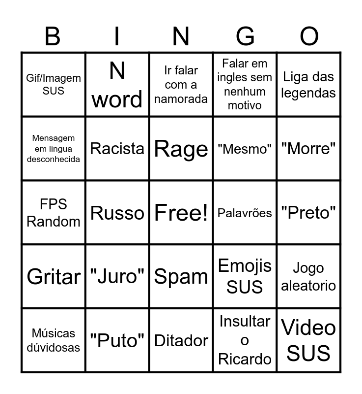 This bingo card has a free space and 24 words: "Juro", "Puto", Rage, Músicas dúvidosas, Liga das legendas, Gif/Imagem SUS, Mensagem em lingua desconhecida, N word, Palavrões, Spam, "Mesmo", FPS Random, Emojis SUS, Jogo aleatorio, Racista, Insultar o Ricardo, "Preto", Ir falar com a namorada, "Morre", Russo, Video SUS, Gritar, Falar em ingles sem nenhum motivo and Ditador.