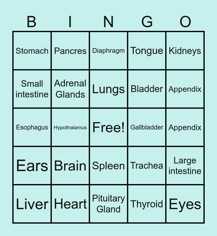 This bingo card has a free space and 24 words: Brain, Heart, Lungs, Liver, Kidneys, Stomach, Small intestine, Pancres, Gallbladder, Spleen, Bladder, Esophagus, Trachea, Large intestine, Adrenal Glands, Thyroid, Appendix, Diaphragm, Appendix, Hypothalamus, Eyes, Ears, Tongue and Pituitary Gland.