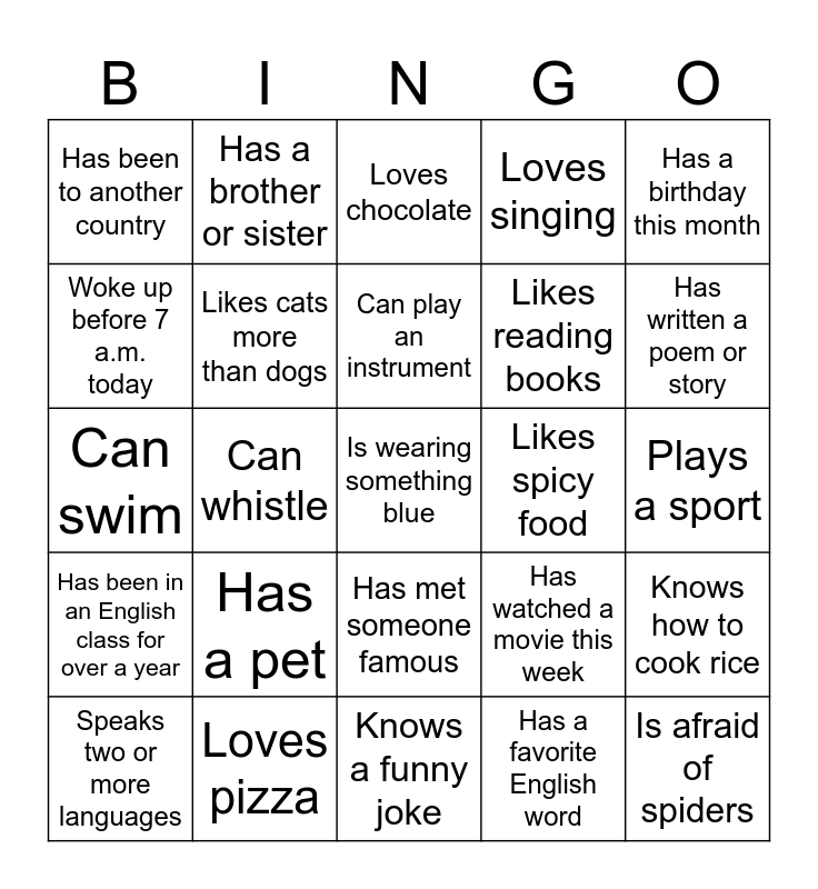 This bingo card has a free space and 24 words: Has a pet, Loves pizza, Can play an instrument, Speaks two or more languages, Has a birthday this month, Has been to another country, Woke up before 7 a.m. today, Has a brother or sister, Likes spicy food, Has met someone famous, Likes reading books, Can swim, Has watched a movie this week, Knows how to cook rice, Likes cats more than dogs, Has a favorite English word, Plays a sport, Loves chocolate, Has written a poem or story, Can whistle, Is afraid of spiders, Has been in an English class for over a year, Loves singing and Knows a funny joke.