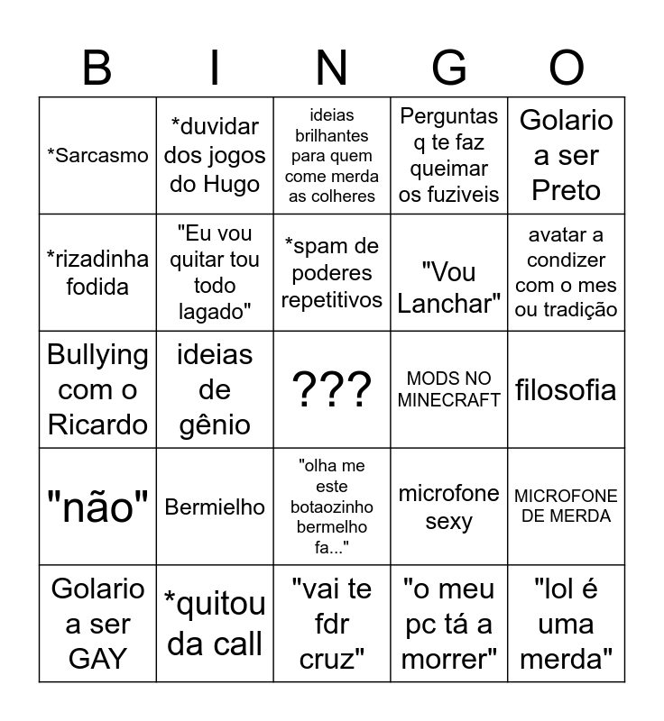 This bingo card has a free space and 24 words: Bermielho, *quitou da call, *spam de poderes repetitivos, Golario a ser GAY, Golario a ser Preto, *Sarcasmo, *rizadinha fodida, *duvidar dos jogos do Hugo, MODS NO MINECRAFT, "olha me este botaozinho bermelho fa...", "Vou Lanchar", Bullying com o Ricardo, microfone sexy, MICROFONE DE MERDA, "Eu vou quitar tou todo lagado", "o meu pc tá a morrer", filosofia, ideias brilhantes para quem come merda as colheres, avatar a condizer com o mes ou tradição, ideias de gênio, "lol é uma merda", "não", Perguntas q te faz queimar os fuziveis and "vai te fdr cruz".