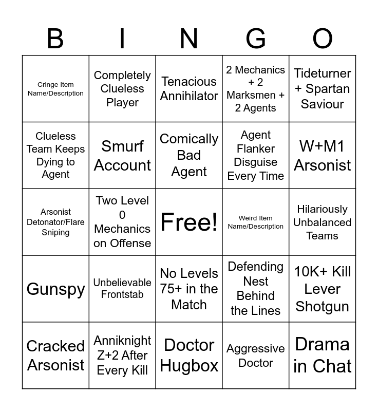 This bingo card has a free space and 37 words: 5+ Non-PC Players, Comically Bad Trollper, 5K+ Kill Market Gardener, Smurf Account, 10K+ Kill Lever Shotgun, Unbelievable Frontstab, Comically Bad Agent, Kunai + Deadringer, Tideturner + Spartan Saviour, PDR Spam, Two Level 0 Mechanics on Offense, 2 Mechanics + 2 Marksmen + 2 Agents, Drama in Chat, Hilariously Unbalanced Teams, Clueless Team Keeps Dying to Agent, Gunspy, Camera Agent, Tenacious Annihilator, No Levels 75+ in the Match, Weird Item Name/Description, Cringe Item Name/Description, W+M1 Arsonist, Cracked Arsonist, Doctor Hugbox, Deranged Positioning, Aggressive Doctor, Completely Clueless Player, Slavic Language in Chat, TF2 Themed Roblox Avatar, Two Brutes on Cart/Point, Flanker Z+2 After Every Kill, Anniknight Z+2 After Every Kill, Arsonist Detonator/Flare Sniping, No Power Classes, Defending Nest Behind the Lines, Agent Flanker Disguise Every Time and Agent Doctor Disguise Every Time.