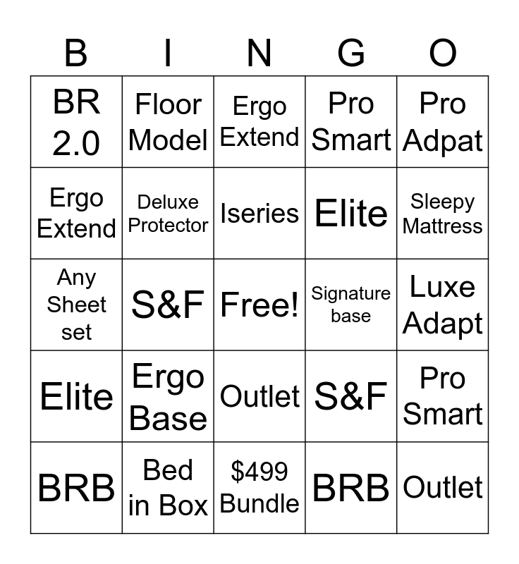 This bingo card has a free space and 24 words: Ergo Base, Bed in Box, Iseries, BRB, Pro Adpat, BR 2.0, Ergo Extend, Floor Model, Signature base, Outlet, Elite, Any Sheet set, S&F, Pro Smart, Deluxe Protector, BRB, Luxe Adapt, Ergo Extend, Sleepy Mattress, S&F, Outlet, Elite, Pro Smart and $499 Bundle.