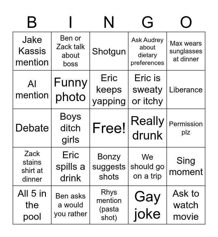 This bingo card has a free space and 24 words: Eric spills a drink, Ben asks a would you rather, Eric keeps yapping, All 5 in the pool, Max wears sunglasses at dinner, Jake Kassis mention, AI mention, Ben or Zack talk about boss, Really drunk, Bonzy suggests shots, Eric is sweaty or itchy, Debate, We should go on a trip, Sing moment, Funny photo, Gay joke, Permission plz, Shotgun, Liberance, Boys ditch girls, Ask to watch movie, Zack stains shirt at dinner, Ask Audrey about dietary preferences and Rhys mention (pasta shot).