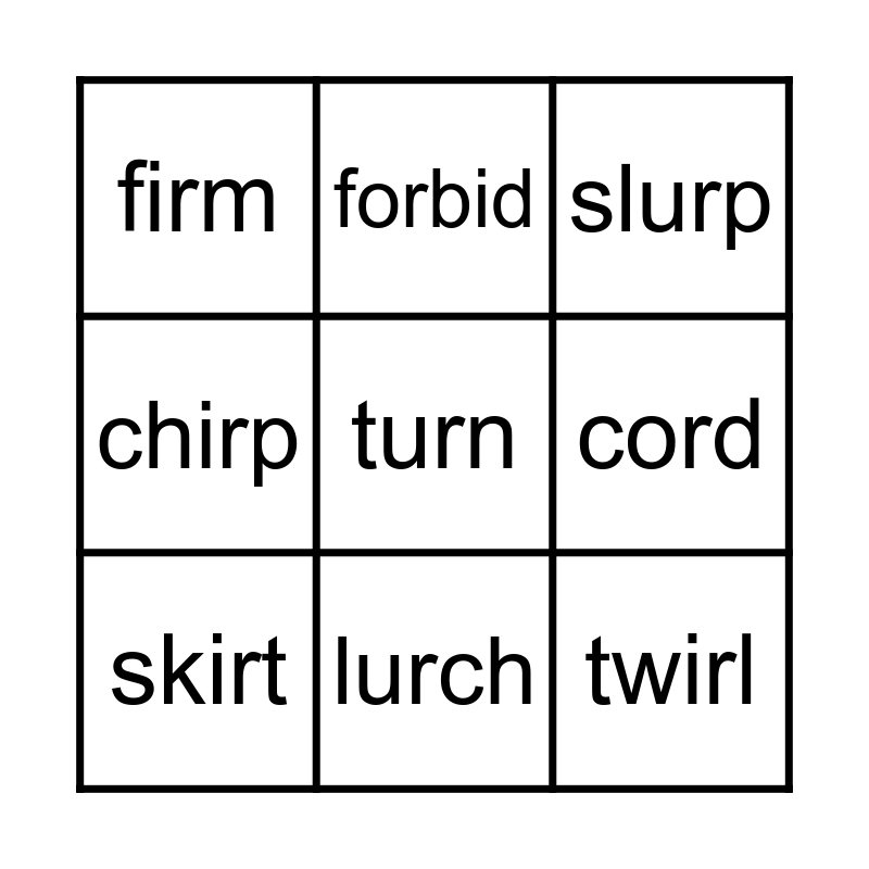 This bingo card has 55 words: bird, dirt, girl, firm, first, shirt, skirt, third, twirl, birth, chirp, smirk, whirl, curl, hurt, surf, turn, curb, lurk, burn, burst, church, return, slurp, turnip, lurch, her, herb, term, fern, perm, clerk, church, born, cord, corn, fork, horn, port, torn, forbid, forget, north, short, sport, stork, storm, thorax, thorn, torch, whip, whiz, whisk, when and which.