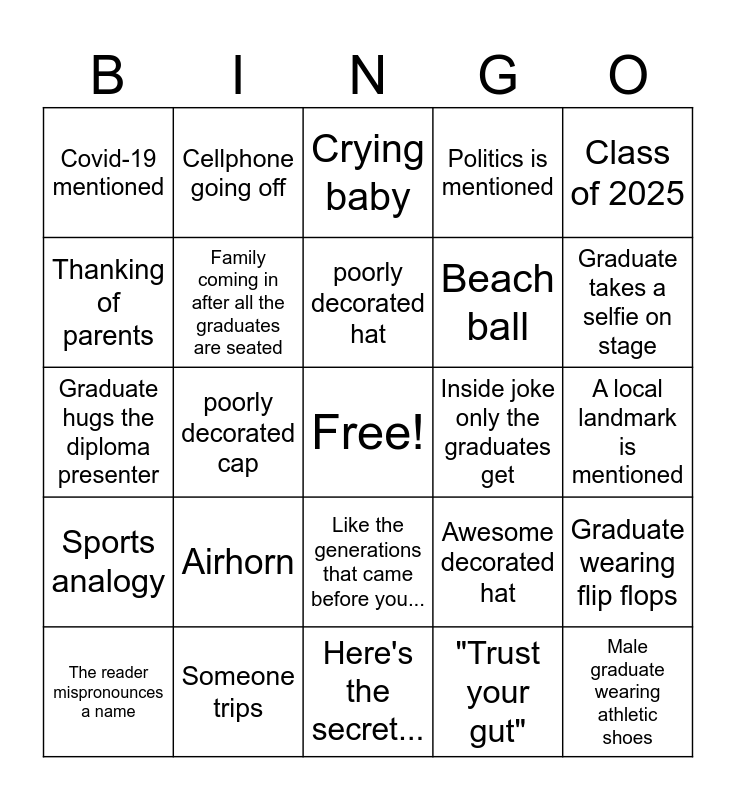 This bingo card has a free space and 24 words: The reader mispronounces a name, Airhorn, poorly decorated hat, "Trust your gut", Class of 2025, Covid-19 mentioned, Cellphone going off, Crying baby, Inside joke only the graduates get, A local landmark is mentioned, Graduate hugs the diploma presenter, Family coming in after all the graduates are seated, Awesome decorated hat, Graduate wearing flip flops, Thanking of parents, Someone trips, Here's the secret..., Politics is mentioned, Graduate takes a selfie on stage, Sports analogy, poorly decorated cap, Like the generations that came before you..., Beach ball and Male graduate wearing athletic shoes.