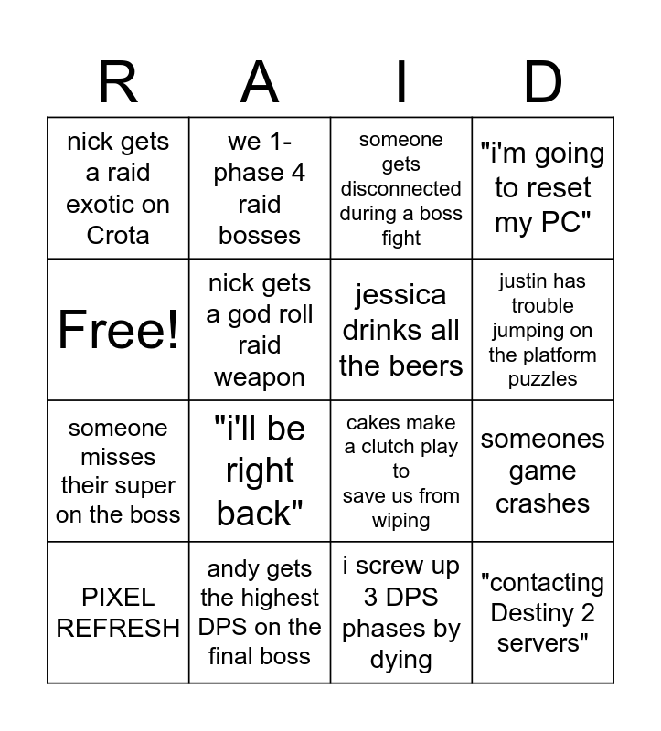 This bingo card has 16 words: andy gets the highest DPS on the final boss, someones game crashes, someone gets disconnected during a boss fight, nick gets a raid exotic on Crota, someone misses their super on the boss, we 1-phase 4 raid bosses, cakes make a clutch play to save us from wiping, i screw up 3 DPS phases by dying, Free!, nick gets a god roll raid weapon, PIXEL REFRESH, "i'm going to reset my PC", "i'll be right back", justin has trouble jumping on the platform puzzles, jessica drinks all the beers and "contacting Destiny 2 servers".