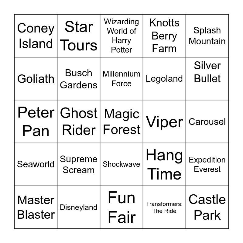 This bingo card has 62 words: Walt Disney World, Disneyland, Universal Studios, Seaworld, Castle Park, Six Flags, Busch Gardens, Hershey Park, Legoland, California Adventure, Knotts Berry Farm, Luna Park, Goliath, Scandia, Autopia, Coney Island, Magic Forest, Splash Mountain, Nitro, Millennium Force, Viper, Wizarding World of Harry Potter, Master Blaster, Transformers: The Ride, El Toro, Matterhorn, Revenge of the Mummy, Tower of Terror, Expedition Everest, Roller Coaster, Swings, Ferris Wheel, Thunder Mountain, Bumper Cars, Carousel, Star Tours, Space Mountain, It's A Small World, Ghost Rider, Haunted Mansion, Peter Pan, Toad's Wild Ride, Supreme Scream, Xcelerator, Silver Bullet, Hang Time, Cotton Candy, Popcorn, Mario Kart: Bowser's Challenge, Pretzels, Shockwave, Fun Fair, Arcade, Hot Dogs, Churros, Nachos, Ice Cream, Pizza, Soak City, Prizes, Santa's Village and Great Wolf Lodge.
