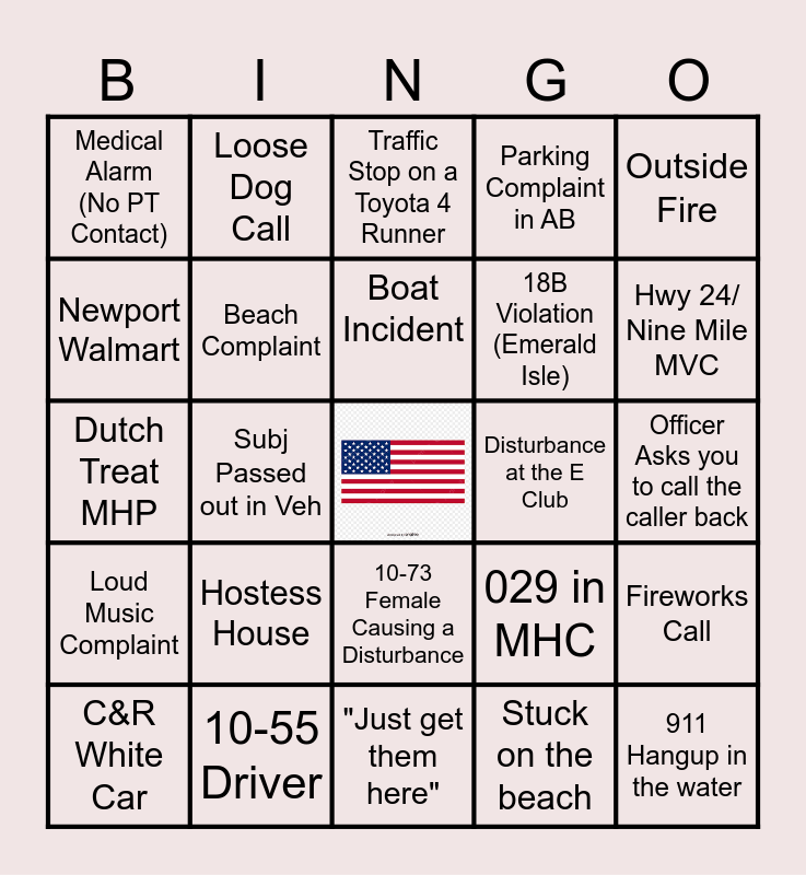 This bingo card has a free space and 24 words: Hostess House, 10-55 Driver, Boat Incident, C&R White Car, Outside Fire, Medical Alarm (No PT Contact), Newport Walmart, Loose Dog Call, Disturbance at the E Club, 10-73 Female Causing a Disturbance, 18B Violation (Emerald Isle), Dutch Treat MHP, 029 in MHC, Fireworks Call, Beach Complaint, Stuck on the beach, Officer Asks you to call the caller back, Traffic Stop on a Toyota 4 Runner, Hwy 24/ Nine Mile MVC, Subj Passed out in Veh, 911 Hangup in the water, Loud Music Complaint, Parking Complaint in AB and "Just get them here".