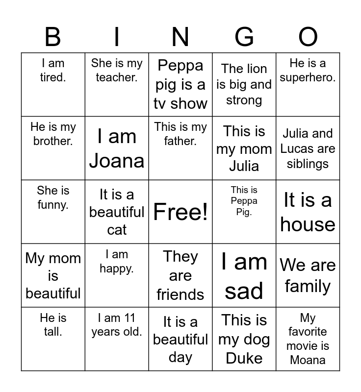 This bingo card has a free space and 24 words: I am happy., I am 11 years old., This is my father., He is tall., He is a superhero., I am tired., He is my brother., She is my teacher., This is Peppa Pig., They are friends, This is my mom Julia, She is funny., I am sad, We are family, I am Joana, This is my dog Duke, It is a house, Peppa pig is a tv show, Julia and Lucas are siblings, It is a beautiful cat, My favorite movie is Moana, My mom is beautiful, The lion is big and strong and It is a beautiful day.