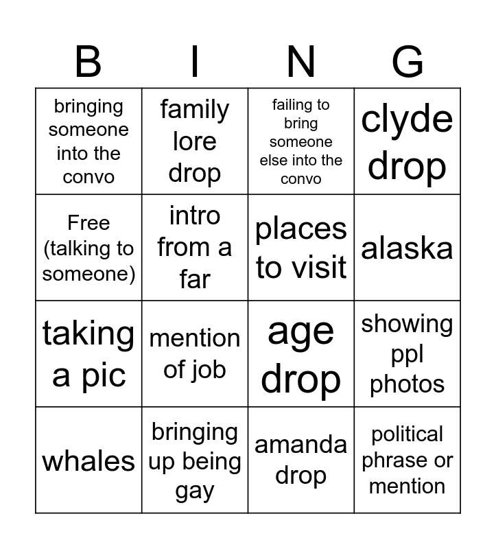This bingo card has 16 words: bringing up being gay, showing ppl photos, failing to bring someone else into the convo, bringing someone into the convo, taking a pic, family lore drop, age drop, amanda drop, Free (talking to someone), intro from a far, whales, clyde drop, mention of job, alaska, places to visit and political phrase or mention.