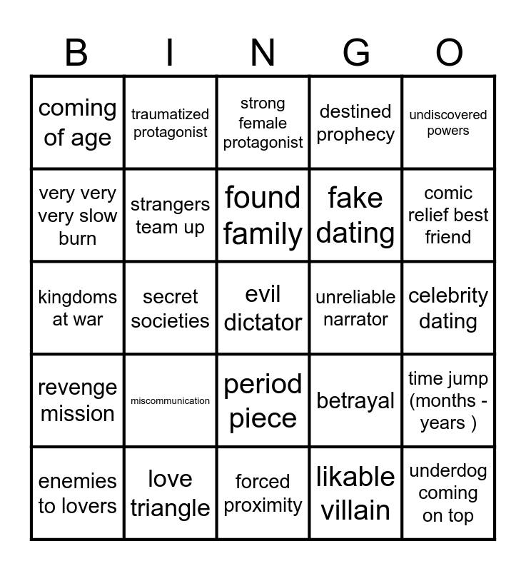 This bingo card has 31 words: enemies to lovers, self sacrifice for the greater good, found family, murder mystery, undiscovered powers, coming of age, strangers team up, period piece, fake dating, unlikable protagonist, revenge mission, secret societies, Free!, likable villain, time jump (months - years ), planned heist, miscommunication, evil dictator, unreliable narrator, underdog coming on top, very very very slow burn, love triangle, forced proximity, destined prophecy, celebrity dating, kingdoms at war, traumatized protagonist, strong female protagonist, betrayal, comic relief best friend and long lost royal.