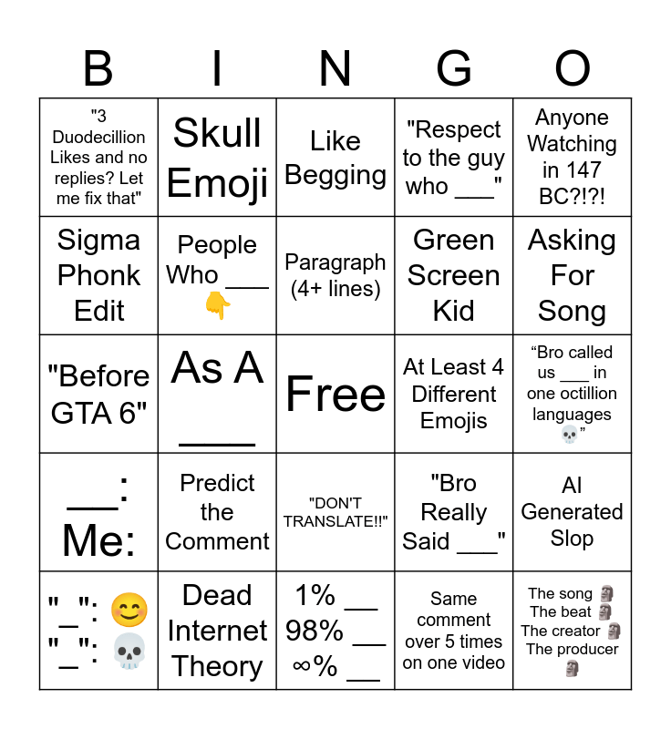 This bingo card has a free space and 33 words: Bot Comment, β β , As A ___, "I watch nine quindecillion times before realize loop", __: Me:, People Who ___ π, Anyone Watching in 147 BC?!?!, "_": π "_": π, Skull Emoji, Horrid Cringe, Paragraph (4+ lines), Like Begging, Actually Funny?, Edit: THANKS FOR 1 LIKE, At Least 4 Different Emojis, Asking For Song, Dead Internet Theory, "Before GTA 6", Predict the Comment, "Bro Really Said ___", "DON'T TRANSLATE!!", "Thought we Wouldn't Notice", "3 Duodecillion Likes and no replies? Let me fix that", βBro called us ___ in one octillion languagesπβ, 1% __ 98% __ β% __, The song πΏ The beat πΏ The creator πΏ The producer πΏ, "Respect to the guy who ___", Green Screen Kid, Sigma Phonk Edit, AI Generated Slop, "___ goes hard", Same comment over 5 times on one video and Tram Emoji π.