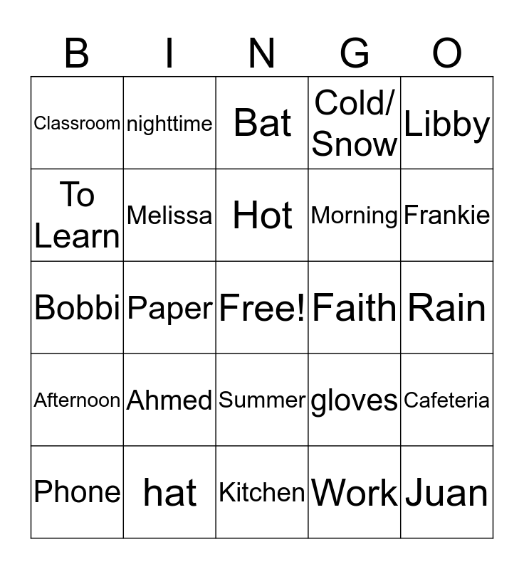 This bingo card has a free space and 24 words: Ahmed, hat, Hot, Phone, Libby, Classroom, To Learn, nighttime, Faith, Summer, Morning, Bobbi, gloves, Cafeteria, Melissa, Work, Rain, Bat, Frankie, Paper, Juan, Afternoon, Cold/ Snow and Kitchen.