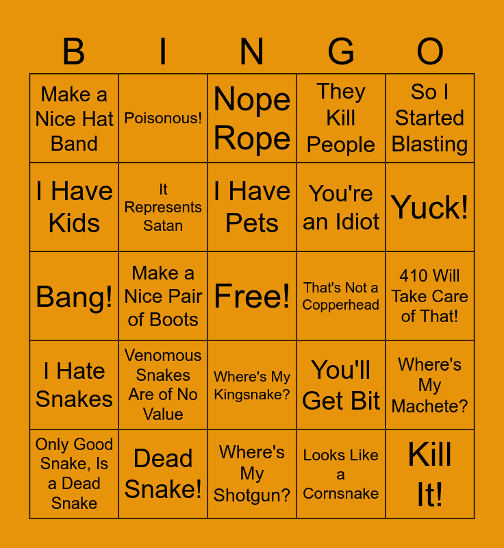 This bingo card has a free space and 24 words: Venomous Snakes Are of No Value, Dead Snake!, I Have Pets, Only Good Snake, Is a Dead Snake, So I Started Blasting, Make a Nice Hat Band, I Have Kids, Poisonous!, That's Not a Copperhead, Where's My Kingsnake?, You're an Idiot, Bang!, You'll Get Bit, Where's My Machete?, It Represents Satan, Looks Like a Cornsnake, 410 Will Take Care of That!, Nope Rope, Yuck!, Make a Nice Pair of Boots, Kill It!, I Hate Snakes, They Kill People and Where's My Shotgun?.