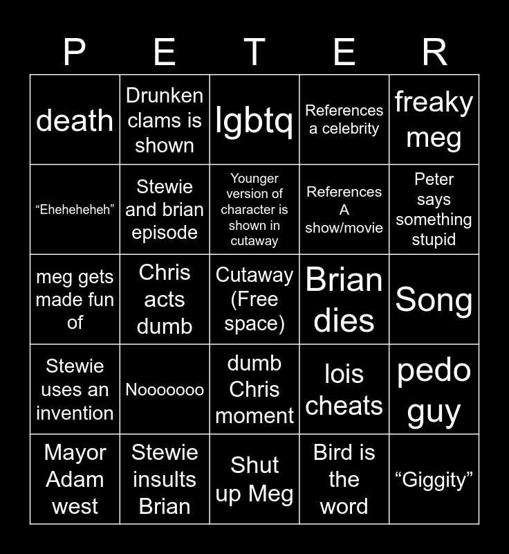 This bingo card has a free space and 27 words: References a song, Stewie insults Brian, Younger version of character is shown in cutaway, Bird is the word, freaky meg, “Eheheheheh”, Drunken clams is shown, Shut up Meg, Brian dies, pedo guy, Stewie uses an invention, Stewie and brian episode, lois cheats, “Giggity”, meg gets made fun of, Racist joke, lgbtq, References a celebrity, Song, death, Nooooooo, dumb Chris moment, References A show/movie, Peter says something stupid, Mayor Adam west, Chris acts dumb and Peter acts dumb.
