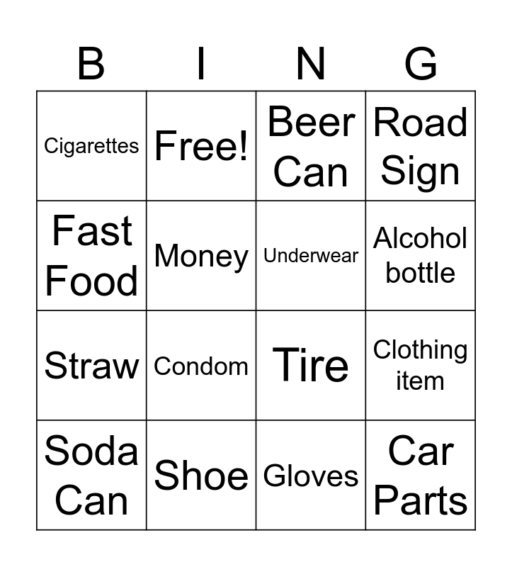 This bingo card has 20 words: Clothing item, Road Kill, Beer Can, Garbage Bag, Soda Can, Fast Food, Shoe, Cigarettes, Straw, Free!, Condom, Tire, Money, Car Parts, Underwear, Mattress, Alcohol bottle, Road Sign, Gloves and Appliances.