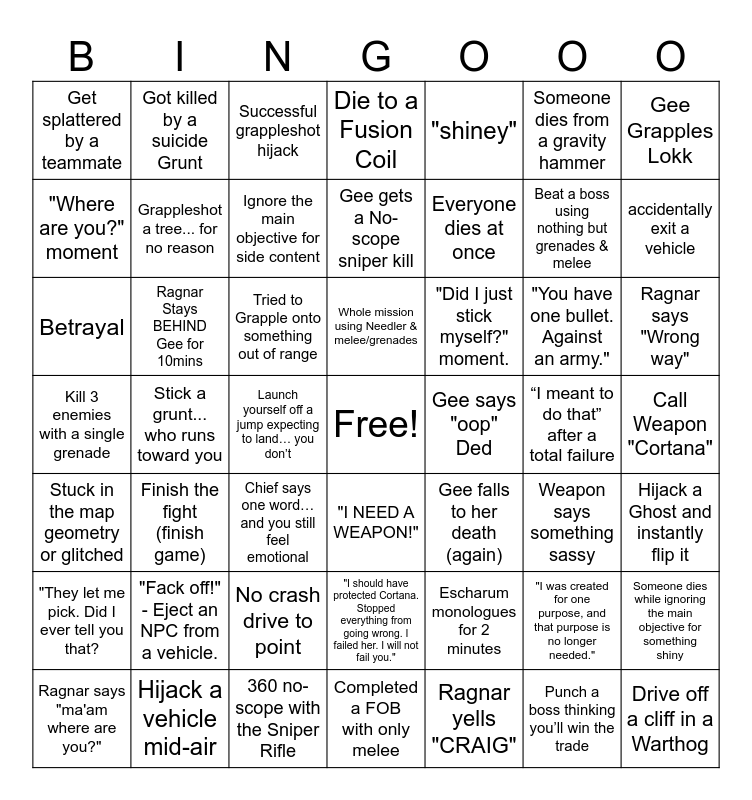 This bingo card has a free space and 52 words: Hijack a vehicle mid-air, Beat a boss using nothing but grenades & melee, Revoke Gee's driving privileges, Stick a grunt... who runs toward you, Tried to Grapple onto something out of range, Weapon says something sassy, Got killed by a suicide Grunt, Punch a boss thinking you’ll win the trade, Someone dies from a gravity hammer, Hijack a Ghost and instantly flip it, Gee Grapples Lokk, "I NEED A WEAPON!", "You have one bullet. Against an army.", "Did I just stick myself?" moment., Escharum monologues for 2 minutes, Chief says one word… and you still feel emotional, "Where are you?" moment, accidentally exit a vehicle, 360 no-scope with the Sniper Rifle, "shiney", Everyone dies at once, Launch yourself off a jump expecting to land… you don’t, Get splattered by a teammate, Grappleshot a tree... for no reason, Completed a FOB with only melee, Drive off a cliff in a Warthog, Call Weapon "Cortana", Ragnar yells "CRAIG", Ignore the main objective for side content, “I meant to do that” after a total failure, ROADKILL!!, Die to a Fusion Coil, "I should have protected Cortana. Stopped everything from going wrong. I failed her. I will not fail you.", "I was created for one purpose, and that purpose is no longer needed.", Stuck in the map geometry or glitched, Successful grappleshot hijack, Kill 3 enemies with a single grenade, Gee falls to her death (again), "They let me pick. Did I ever tell you that?, "Fack off!" - Eject an NPC from a vehicle., No crash drive to point, Betrayal, Ragnar Stays BEHIND Gee for 10mins, Friendly fire drama, Whole mission using Needler & melee/grenades, Gee says "oop" Ded, Finish the fight (finish game), Gee gets a No-scope sniper kill, Someone dies while ignoring the main objective for something shiny, Ragnar says "ma'am where are you?", Ragnar says "Wrong way" and Gee explores (gets lost).