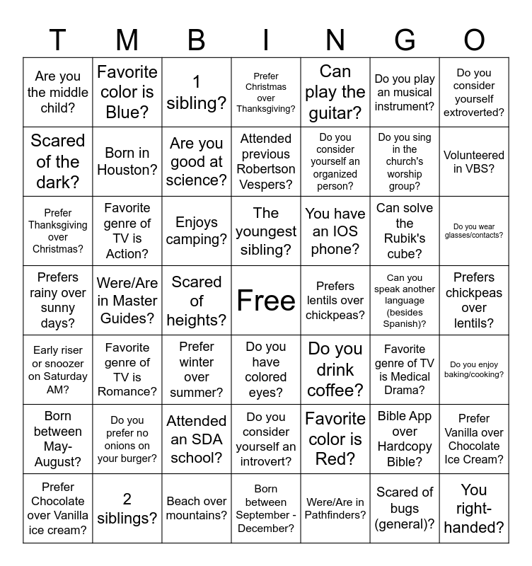 This bingo card has a free space and 83 words: Are you a morning person?, Do you consider yourself an introvert?, 1 sibling?, 2 siblings?, 3 siblings?, 4+ siblings?, Do you prefer no onions on your burger?, Born between January-April?, Born between May-August?, Born between September - December?, Do you have a dog?, Do you like to read books?, Do you consider yourself extroverted?, Volunteered in VBS?, Do you have a cat?, Are you the middle child?, Do you wear glasses/contacts?, Do you play an musical instrument?, Do you have a pet reptile?, Do you have colored eyes?, Do you enjoy baking/cooking?, Born in Houston?, Do you sing in the church's worship group?, Do you have brown eyes?, Do you consider yourself an organized person?, Do you prefer onions on your burger?, Were/Are in Pathfinders?, Has a pet fish?, Have you broken a bone?, Consider yourself a night owl?, Enjoys camping?, You left-handed?, Do you drink coffee?, Attended previous Robertson Vespers?, You right-handed?, Can you speak another language (besides Spanish)?, Were/Are in Master Guides?, Are you good at math?, Are you good at science?, Favorite genre of TV is Action?, Favorite genre of TV is Romance?, Favorite genre of TV is Medical Drama?, Favorite genre of TV is Comedy?, Favorite genre of TV is Mystery/Legal?, Prefer Chocolate over Vanilla ice cream?, Prefer Vanilla over Chocolate Ice Cream?, Favorite color is Blue?, Favorite color is Red?, Can eat spicy food?, You have an android phone?, You have an IOS phone?, Prefer Christmas over Thanksgiving?, Prefer Thanksgiving over Christmas?, Prefers sunny over rainy days?, Prefer Cake over Pie?, Prefer Pie over Cake?, Prefer winter over summer?, Prefer summer over winter?, Prefers rainy over sunny days?, Been to Camporee?, Attended an SDA school?, Attended an SDA university?, Been on a mission trip?, Can play the guitar?, Can play the piano?, Can solve the Rubik's cube?, Has preached a sermon before?, Early riser or snoozer on Saturday AM?, Prefer Sweet breakfast over Salty breakfast?, Prefer Salty breakfast over Sweet breakfast?, Hardcopy Bible over Bible App?, Bible App over Hardcopy Bible?, Has a twin?, The youngest sibling?, Scared of heights?, Scared of clowns?, Scared of bugs (general)?, Scared of the dark?, Prefers chickpeas over lentils?, Prefers lentils over chickpeas?, Beach over mountains?, Mountains over Beach? and Doesn't like chocolate?.
