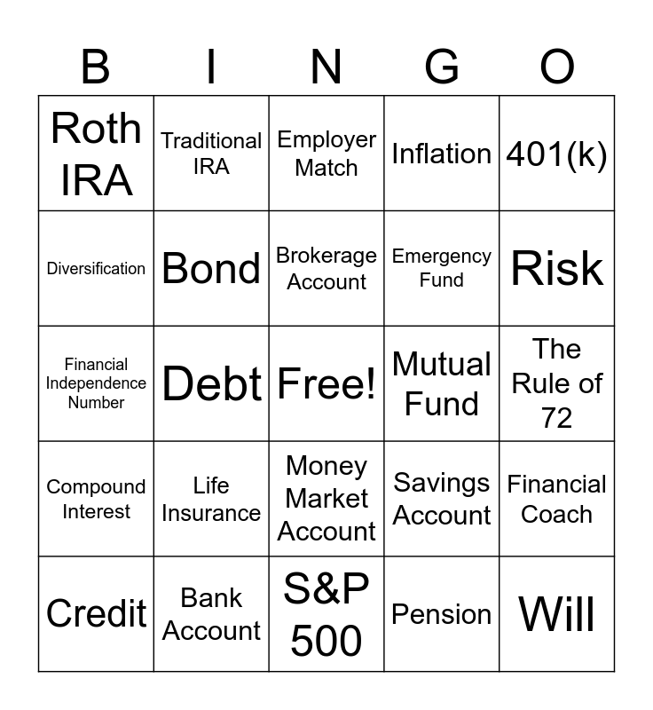 This bingo card has a free space and 24 words: Credit, Life Insurance, Brokerage Account, Pension, 401(k), Roth IRA, Traditional IRA, Employer Match, Mutual Fund, The Rule of 72, Financial Independence Number, Bond, Savings Account, Financial Coach, Diversification, Bank Account, S&P 500, Inflation, Risk, Compound Interest, Debt, Money Market Account, Emergency Fund and Will.
