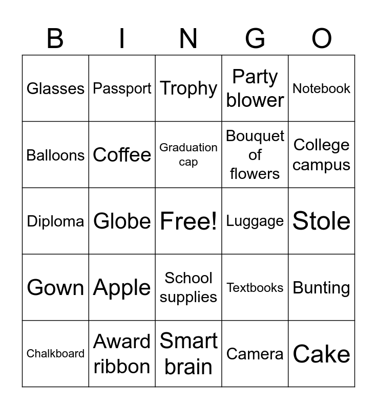 This bingo card has a free space and 24 words: Apple, Award ribbon, Graduation cap, Chalkboard, Notebook, Glasses, Balloons, Passport, Luggage, School supplies, Bouquet of flowers, Diploma, Textbooks, Bunting, Coffee, Camera, Stole, Trophy, College campus, Globe, Cake, Gown, Party blower and Smart brain.