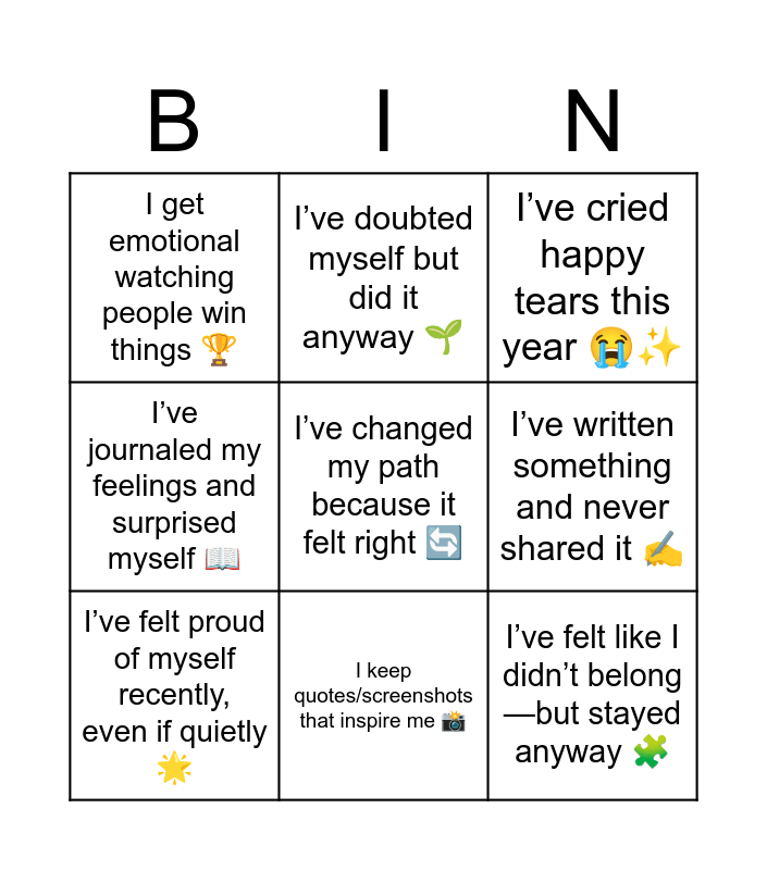 This bingo card has 26 words: I’ve danced alone like I’m in a movie 🎬, I’ve hyped a friend up like it’s my job 💃, I keep quotes/screenshots that inspire me 📸, I have a secret dream I haven’t told many people 🌠, I’ve changed my path because it felt right 🔄, I get emotional watching people win things 🏆, I’ve written something and never shared it ✍️, I’ve doubted myself but did it anyway 🌱, I’ve been the one to ask the hard question in a group ❓, I love organizing things just for the joy of it 🗂️, I’ve felt like I didn’t belong—but stayed anyway 🧩, I’ve cheered louder for someone else’s win than my own 📣, I’ve done something scary and been proud of it 🧗, I’ve stayed up thinking about the future 🌙, I’ve helped someone even when I was struggling 💪, I’ve daydreamed about changing the world 🌍, I’ve journaled my feelings and surprised myself 📖, I’m the go-to advice person for someone 🧭, I’ve cried happy tears this year 😭✨, I’ve had a great idea in the shower 🚿💡, I’ve shown up for something even when I felt nervous 🎤, I believe in small acts of kindness 💌, I’ve found joy in a tiny unexpected moment recently 🌈, I’ve supported a cause or person I deeply believe in ✊, I’ve felt proud of myself recently, even if quietly 🌟 and Who am I? I’d describe myself in 3 emojis 🧠🎧🌻.