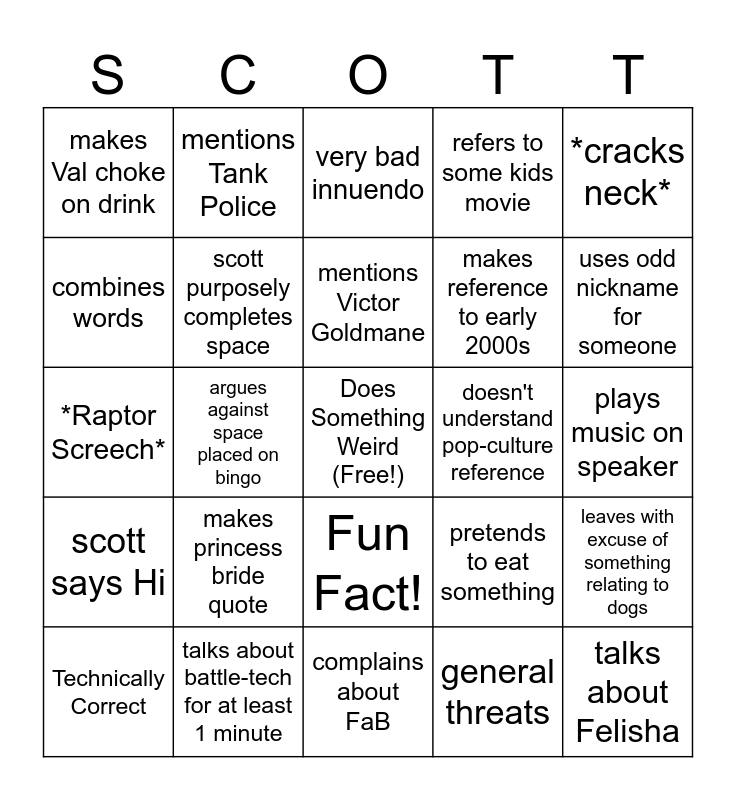This bingo card has a free space and 29 words: Technically Correct, Uses word longer than 10 letters, argues against space placed on bingo, makes you question life choices, makes Val choke on drink, very bad innuendo, scott purposely completes space, makes princess bride quote, doesn't understand pop-culture reference, talks about battle-tech for at least 1 minute, plays music on speaker, talks about Felisha, complains about FaB, general threats, uses odd nickname for someone, changes syllables around, Fun Fact!, scott says Hi, *cracks neck*, *Raptor Screech*, pretends to eat something, Breaks out in song, makes reference to early 2000s, combines words, refers to some kids movie, mentions Tank Police, leaves with excuse of something relating to dogs, mentions Victor Goldmane and removes letters from a word.