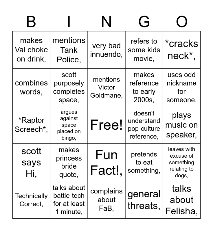 This bingo card has a free space and 29 words: Technically Correct,, Uses word longer than 10 letters,, argues against space placed on bingo,, makes you question life choices,, makes Val choke on drink,, very bad innuendo,, scott purposely completes space,, makes princess bride quote,, doesn't understand pop-culture reference,, talks about battle-tech for at least 1 minute,, plays music on speaker,, talks about Felisha,, complains about FaB,, general threats,, uses odd nickname for someone,, changes syllables around,, Fun Fact!,, scott says Hi,, *cracks neck*,, *Raptor Screech*,, pretends to eat something,, Breaks out in song,, makes reference to early 2000s,, combines words,, refers to some kids movie,, mentions Tank Police,, leaves with excuse of something relating to dogs,, mentions Victor Goldmane, and removes letters from a word..