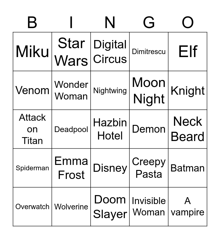This bingo card has a free space and 24 words: Emma Frost, Wolverine, Nightwing, Overwatch, Elf, Miku, Venom, Star Wars, Demon, Disney, Moon Night, Attack on Titan, Creepy Pasta, Batman, Wonder Woman, Invisible Woman, Neck Beard, Digital Circus, Knight, Deadpool, A vampire, Spiderman, Dimitrescu and Doom Slayer.