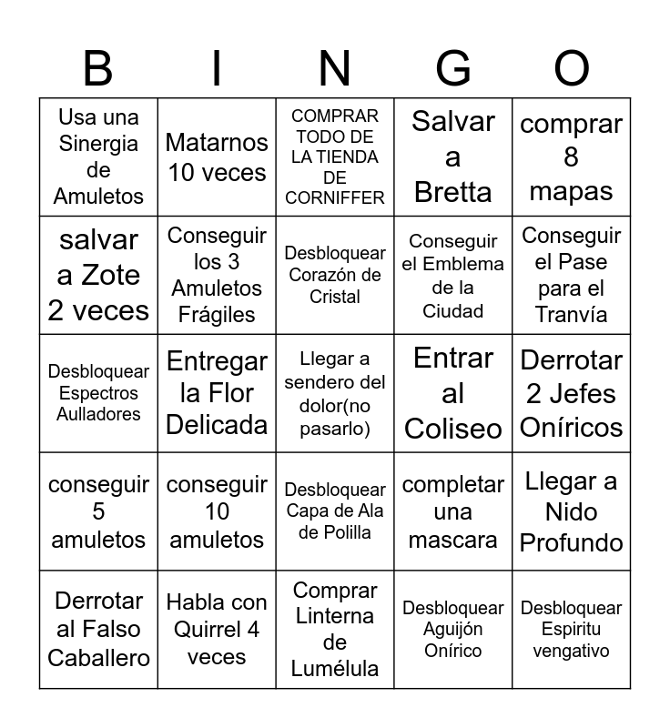 This bingo card has 25 words: conseguir 10 amuletos, Comprar Linterna de Lumélula, Desbloquear Corazón de Cristal, Derrotar al Falso Caballero, comprar 8 mapas, Usa una Sinergia de Amuletos, salvar a Zote 2 veces, Matarnos 10 veces, Entrar al Coliseo, Desbloquear Capa de Ala de Polilla, Conseguir el Emblema de la Ciudad, Desbloquear Espectros Aulladores, completar una mascara, Llegar a Nido Profundo, Conseguir los 3 Amuletos Frágiles, Desbloquear Espiritu vengativo, Derrotar 2 Jefes Oníricos, COMPRAR TODO DE LA TIENDA DE CORNIFFER, Conseguir el Pase para el Tranvía, Entregar la Flor Delicada, Llegar a sendero del dolor(no pasarlo), Habla con Quirrel 4 veces, conseguir 5 amuletos, Salvar a Bretta and Desbloquear Aguijón Onírico.
