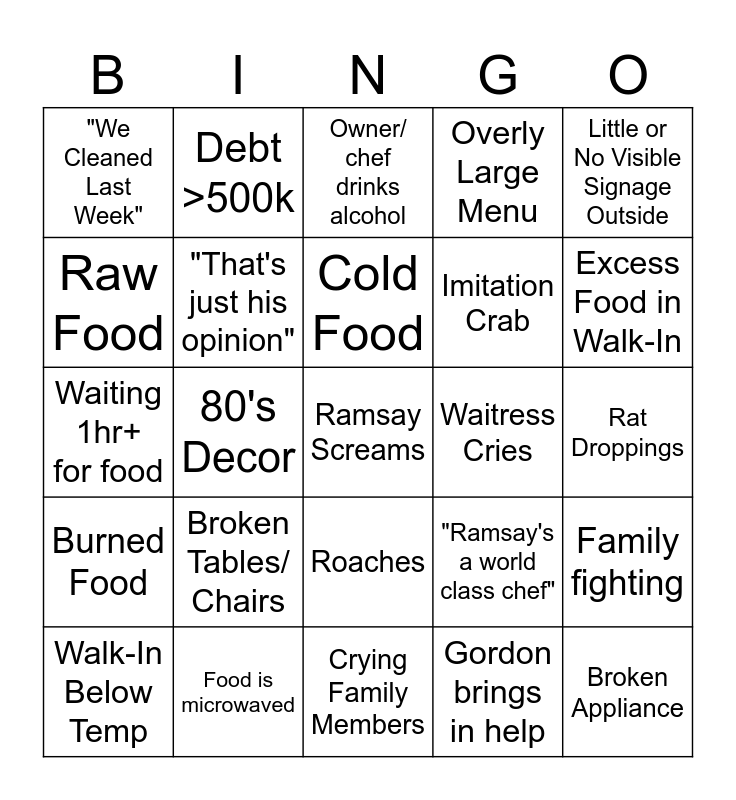 This bingo card has a free space and 39 words: Handful of Slime or Sludge, Moldy Food, Menu Items Not Available, "That's just his opinion", Walk-In Below Temp, Roaches, Cold Food, Manager Lies About Something Stupid, Little or No Visible Signage Outside, Burned Food, 80's Decor, Overly Large Menu, Broken Appliance, Rat Droppings, Waitress Cries, Broken Tables/ Chairs, Mold in Walk-In, "We Cleaned Last Week", The Mayor Visits, "Ramsay's a world class chef", Raw Food, Crying Family Members, Imitation Crab, Excess Food in Walk-In, "You donut", Chef/owner calls food a 10/10, Have wait staff taste food, Gordon makes a pun, Gordon likes a pre fix dish, Debt >500k, Lasted more than 2 years, Kitchen staff smokes, Owner/ chef drinks alcohol, Food is microwaved, Gordon brings in help, Reverts to old ways, Family fighting, Waiting 1hr+ for food and Someone rage leaves the building.