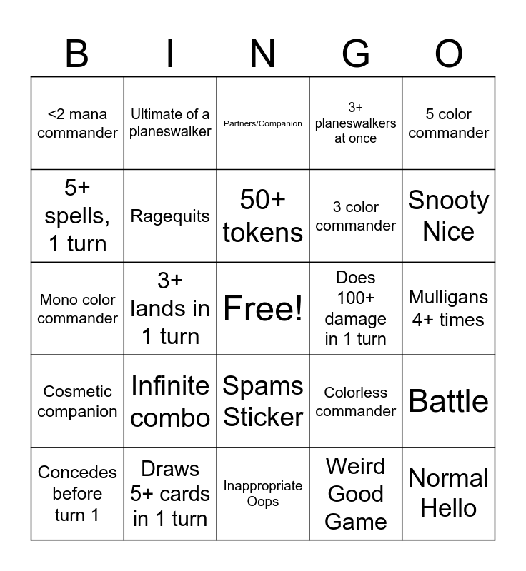 This bingo card has a free space and 29 words: Concedes before turn 1, Counters my wincon, 3+ lands in 1 turn, Turn 2 arcane signet into something, <2 mana commander, Partners/Companion, Ragequits, Infinite combo, Does 100+ damage in 1 turn, Draws 5+ cards in 1 turn, Mulligans 4+ times, Normal Hello, Inappropriate Oops, Weird Good Game, Snooty Nice, Rude Your Go, Spams Sticker, Cosmetic companion, 5 color commander, Mono color commander, Colorless commander, 2 color commander, 3 color commander, 5+ spells, 1 turn, 3+ planeswalkers at once, Ultimate of a planeswalker, Battle, 50+ tokens and Deck half empty.