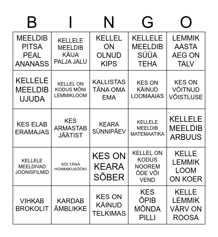 This bingo card has a free space and 24 words: SÕI TÄNA HOMMIKUSÖÖKI, KARDAB ÄMBLIKKE, KALLISTAS TÄNA OMA EMA, VIHKAB BROKOLIT, LEMMIK AASTA AEG ON TALV, MEELDIB PITSA PEAL ANANASS, KELLELE MEELDIB UJUDA, KELLELE MEELDIB KÄIJA PALJA JALU, KELLELE MEELDIB MATEMAATIKA, KES ON KEARA SÕBER, KES ON KÄINUD LOOMAAIAS, KES ELAB ERAMAJAS, KELLEL ON KODUS NOOREM ÕDE VÕI VEND, KELLE LEMMIK LOOM ON KOER, KELLEL ON KODUS MÕNI LEMMIKLOOM, KES ÕPIB MÕNDA PILLI, KELLELE MEELDIB ARBUUS, KELLEL ON OLNUD KIPS, KES ON VÕITNUD VÕISTLUSE, KES ARMASTAB JÄÄTIST, KELLE LEMMIK VÄRV ON ROOSA, KELLELE MEELDIVAD JOONISFILMID, KELLELE MEELDIB SÜÜA TEHA and KES ON KÄINUD TELKIMAS.