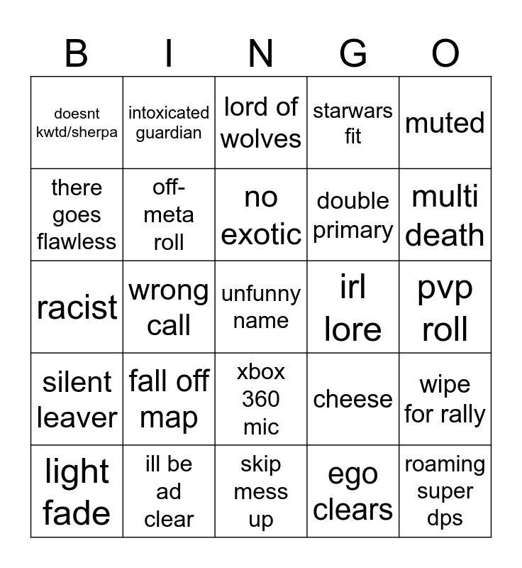 This bingo card has 25 words: silent leaver, ill be ad clear, unfunny name, ego clears, muted, doesnt kwtd/sherpa, intoxicated guardian, lord of wolves, irl lore, wipe for rally, there goes flawless, off-meta roll, skip mess up, cheese, multi death, light fade, wrong call, no exotic, double primary, pvp roll, racist, fall off map, xbox 360 mic, starwars fit and roaming super dps.
