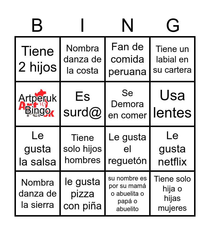 This bingo card has 1 images and 35 words: Le gusta cocinar, Es hij@ unic@, Nació en diciembre, Usa lentes, Nombra una Danza de la selva, Es surd@, Se Demora en comer, Tiene gato o gatos, Artperuk Bingo, Su nombre no tiene vocal E, Le gusta el reguetón, Tiene un labial en su cartera, Tiene perr@, Se ha casado, Fan de comida peruana, Tiene solo hija o hijas mujeres, Tiene más de 2 años en UK, le gusta pizza con piña, su nombre es por su mamá o abuelita o papá o abuelito, Le gusta netflix, Está estudiando una maestria, Le gusta cantar en karaoke, Sabe cocinar, Sabe tocar un instrumento musical, Tiene 2 hijos, Tiene solo hijos hombres, Está usando zapatillas ahora, No le gusta hablar en publico, Le gusta la salsa, Sabe nadar, FREE!, Le encanta el aji, Nombra danza de la sierra, Nombra danza de la costa and Tiene cabello negro.