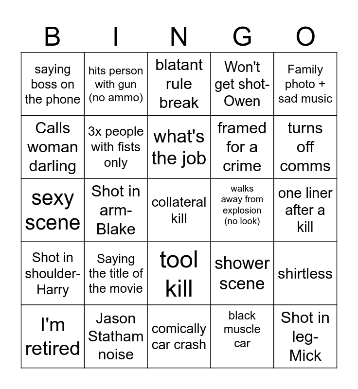 This bingo card has a free space and 24 words: Saying the title of the movie, Jason Statham noise, what's the job, I'm retired, Family photo + sad music, saying boss on the phone, Calls woman darling, hits person with gun (no ammo), walks away from explosion (no look), tool kill, framed for a crime, sexy scene, shower scene, shirtless, 3x people with fists only, black muscle car, one liner after a kill, blatant rule break, turns off comms, Shot in arm-Blake, Shot in leg-Mick, Shot in shoulder-Harry, Won't get shot-Owen and comically car crash.