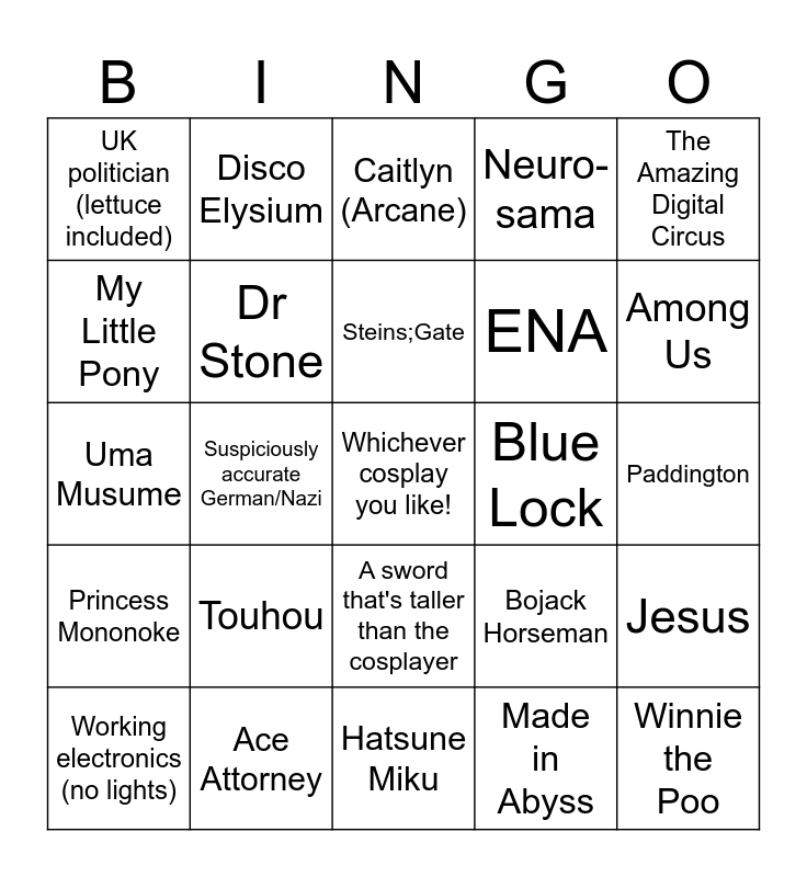 This bingo card has a free space and 24 words: Touhou, Ace Attorney, Steins;Gate, Working electronics (no lights), The Amazing Digital Circus, UK politician (lettuce included), My Little Pony, Disco Elysium, Blue Lock, A sword that's taller than the cosplayer, ENA, Uma Musume, Bojack Horseman, Jesus, Dr Stone, Made in Abyss, Paddington, Caitlyn (Arcane), Among Us, Suspiciously accurate German/Nazi, Winnie the Poo, Princess Mononoke, Neuro-sama and Hatsune Miku.