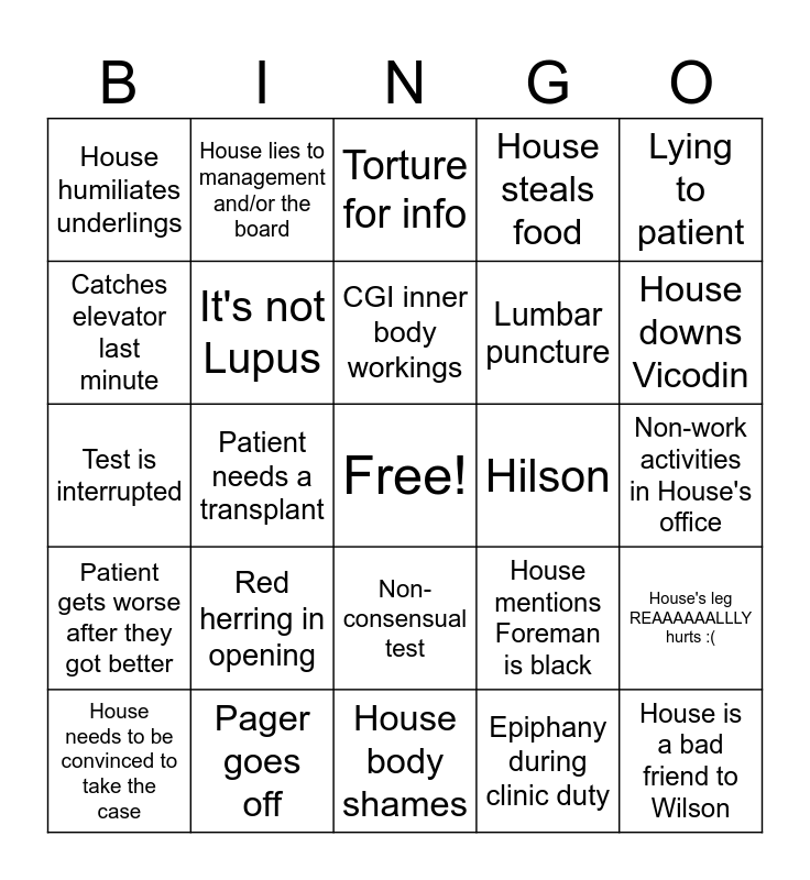 This bingo card has a free space and 41 words: Two options: risky treatment or DIE, Red herring in opening, Patient has a seizure, Lumbar puncture, House is a bad friend to Wilson, Patient gets worse after they got better, Patient needs a transplant, Intubation, House steals food, Non-work activities in House's office, Catches elevator last minute, It's not Lupus, CGI inner body workings, Epiphany during clinic duty, House downs Vicodin, Test is interrupted, Weird metaphor, Torture for info, Patient lies, Lying to patient, House needs to be convinced to take the case, Breaking into someone's home, Non-consensual test, Hilson, Improper use of cane, "Treat [1] if they get worse it's [2]", Pager goes off, Chase performs surgery, House mentions Foreman is black, More than 3 incorrect diagnosis, Cuddy enables House, House lies to management and/or the board, House body shames, House mentions Chase is rich, House's leg REAAAAAALLLY hurts :(, House humiliates underlings, House and/or staff gambles inappropriately, House talks about confidential patient information in front of random people, Differential diagnosis, House mentions Cameron is genuine and Inappropriate behaviour in front of or to a clinic patient.