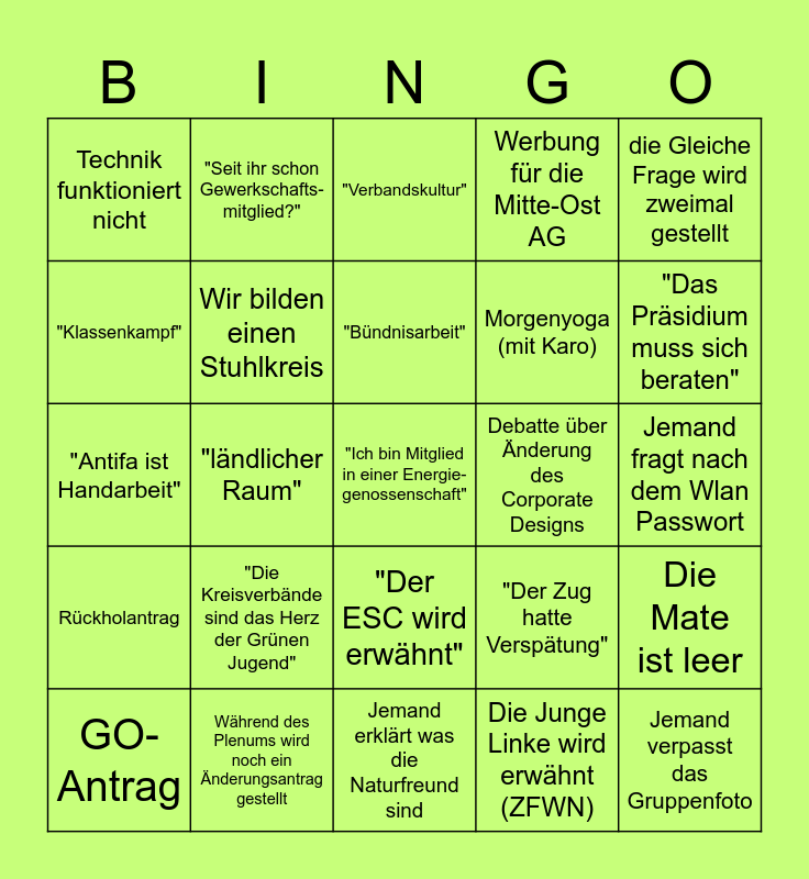 This bingo card has a free space and 24 words: "Die Kreisverbände sind das Herz der Grünen Jugend", Während des Plenums wird noch ein Änderungsantrag gestellt, "Bündnisarbeit", GO-Antrag, die Gleiche Frage wird zweimal gestellt, Technik funktioniert nicht, "Klassenkampf", "Seit ihr schon Gewerkschafts-mitglied?", Debatte über Änderung des Corporate Designs, "Der ESC wird erwähnt", Morgenyoga (mit Karo), "Antifa ist Handarbeit", "Der Zug hatte Verspätung", Die Mate ist leer, Wir bilden einen Stuhlkreis, Die Junge Linke wird erwähnt (ZFWN), Jemand fragt nach dem Wlan Passwort, "Verbandskultur", "Das Präsidium muss sich beraten", "ländlicher Raum", Jemand verpasst das Gruppenfoto, Rückholantrag, Werbung für die Mitte-Ost AG and Jemand erklärt was die Naturfreund sind.