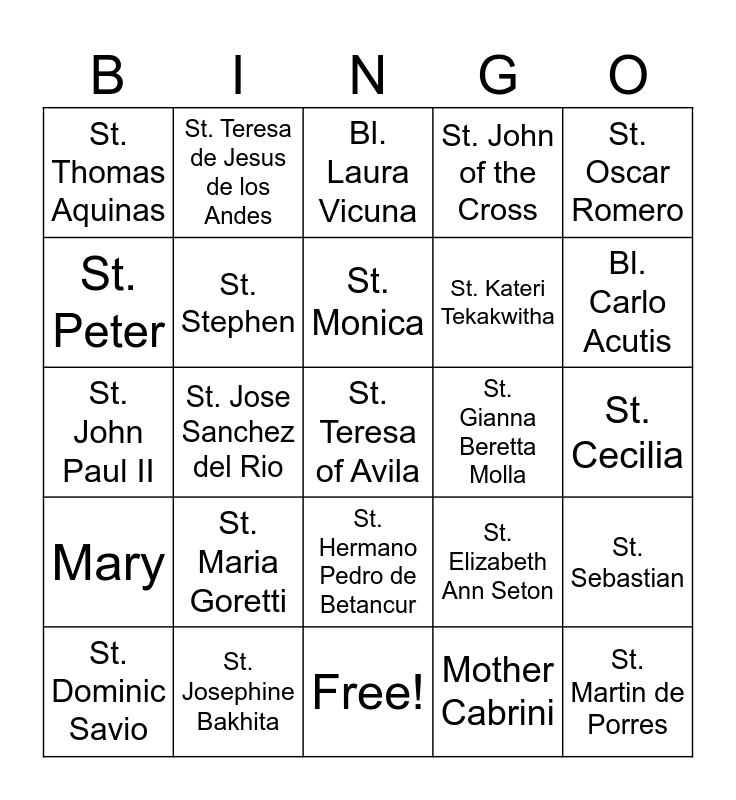 This bingo card has a free space and 31 words: Free!, St. Joseph, St. Jose Sanchez del Rio, Bl. Pier Giorgio Frasatti, St. Thomas Aquinas, Bl. Laura Vicuna, St. Stephen, St. Elizabeth Ann Seton, St. Gianna Beretta Molla, Mother Cabrini, St. Cecilia, St. Martin de Porres, St. Laura Montoya, St. Therese of Lisieux, Bl. Carlo Acutis, St. Francis of Assisi, St. Sebastian, St. Maria Goretti, Mary, St. Hermano Pedro de Betancur, St. Oscar Romero, Don Bosco, St. Dominic Savio, St. Teresa de Jesus de los Andes, St. Kateri Tekakwitha, St. Peter, St. John of the Cross, St. John Paul II, St. Josephine Bakhita, St. Monica and St. Augustin.