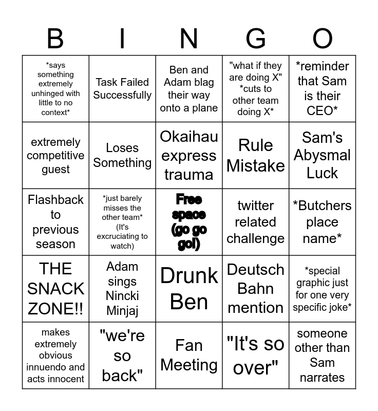 This bingo card has a free space and 24 words: Adam sings Nincki Minjaj, "we're so back", Okaihau express trauma, makes extremely obvious innuendo and acts innocent, *reminder that Sam is their CEO*, *says something extremely unhinged with little to no context*, extremely competitive guest, Task Failed Successfully, twitter related challenge, Drunk Ben, Rule Mistake, Flashback to previous season, Deutsch Bahn mention, *special graphic just for one very specific joke*, Loses Something, "It's so over", *Butchers place name*, Ben and Adam blag their way onto a plane, Sam's Abysmal Luck, *just barely misses the other team* (It's excruciating to watch), someone other than Sam narrates, THE SNACK ZONE!!, "what if they are doing X" *cuts to other team doing X* and Fan Meeting.