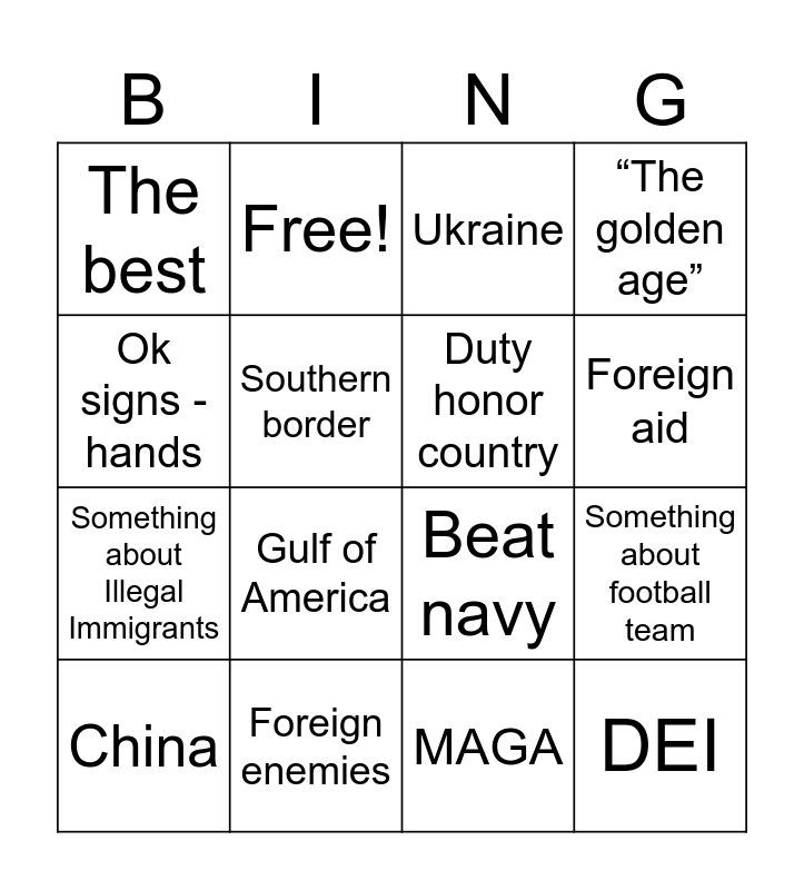 This bingo card has 16 words: Foreign enemies, Something about football team, Ukraine, The best, Something about Illegal Immigrants, Free!, Beat navy, MAGA, Ok signs - hands, Southern border, China, “The golden age”, Gulf of America, Foreign aid, Duty honor country and DEI.