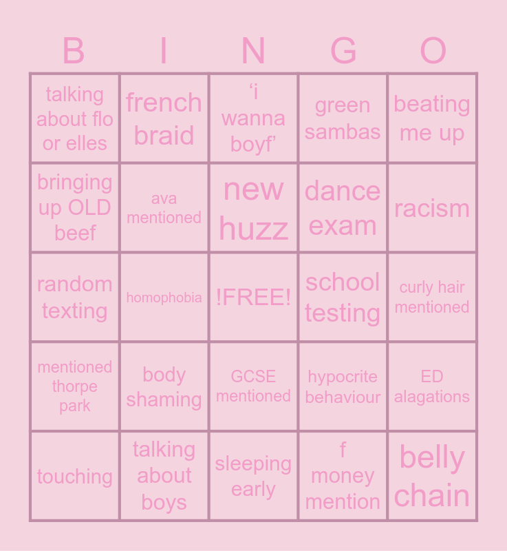This bingo card has a free space and 24 words: body shaming, talking about boys, new huzz, touching, beating me up, talking about flo or elles, bringing up OLD beef, french braid, school testing, GCSE mentioned, dance exam, random texting, hypocrite behaviour, ED alagations, ava mentioned, f money mention, curly hair mentioned, ‘i wanna boyf’, racism, homophobia, belly chain, mentioned thorpe park, green sambas and sleeping early.