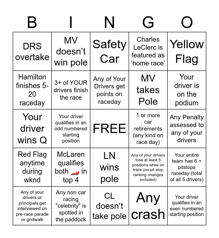 This bingo card has a free space and 29 words: Your driver starts 15th -20th on the grid, Any non car racing "celebrity" is spotted in the paddock, Safety Car, Virtual Safety Car, Yellow Flag, DRS overtake, 3+ of YOUR drivers finish the race, Any of Your Drivers get points on raceday, 1 or more car retirements (any kind on race day), Your entire team has 6 + pitstops raceday (total of all 5 drivers), Any of your drivers or principals get interviewed on pre-race parade or gridwalk, Your driver qualifies in an odd numbered starting position, Any crash, Your driver qualifies in an even numbered starting position, Your driver wins Q, Any of your drivers finish P11 - P13 raceday, CL doesn’t take pole, Any of your drivers lose at least 5 positions while on track (no pit stop ranking changes included), Your driver is on the podium, Red Flag anytime during wknd, McLaren qualifies both 🏎️ in top 4, Your driver wins Fastest Lap, MV takes Pole, Any Penalty assessed to any of your drivers, Hamilton finishes 5-20 raceday, MV doesn’t win pole, LN wins pole, Charles LeClerc is featured as ‘home race’ and Ferrari qualifies both 🏎️ top 4.