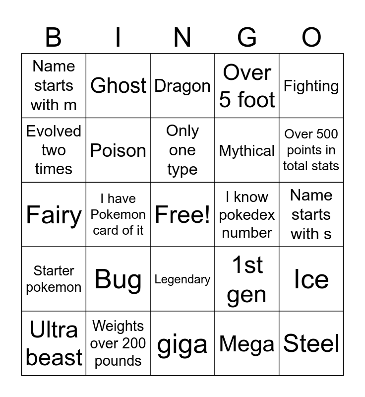 This bingo card has a free space and 24 words: Bug, Weights over 200 pounds, Only one type, Ultra beast, Fighting, Name starts with m, Evolved two times, Ghost, I know pokedex number, Legendary, Mythical, Fairy, 1st gen, Ice, Poison, Mega, Name starts with s, Dragon, Over 500 points in total stats, I have Pokemon card of it, Steel, Starter pokemon, Over 5 foot and giga.
