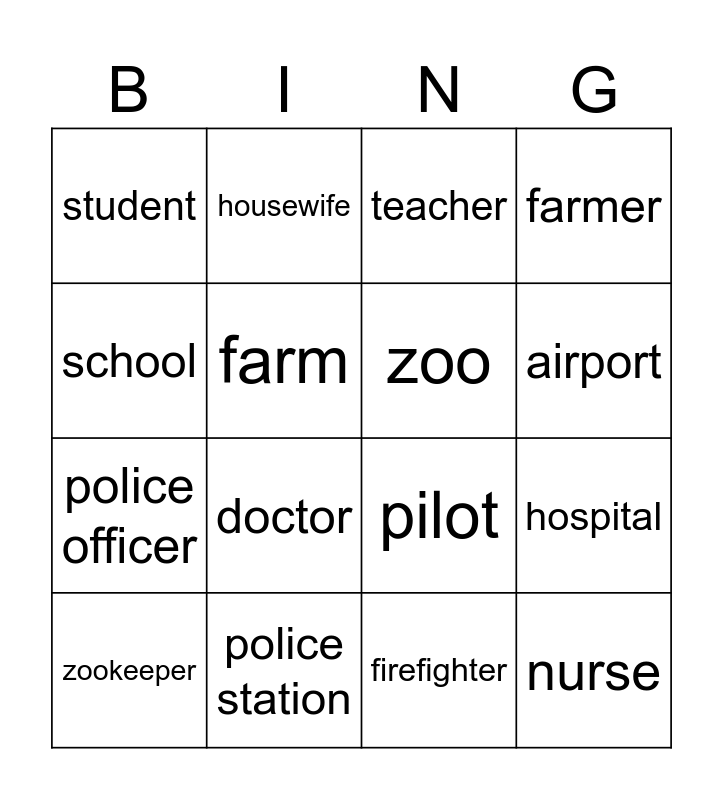 This bingo card has 18 words: doctor, nurse, teacher, student, pilot, farmer, zookeeper, housewife, airport, police officer, firefighter, school, hospital, farm, zoo, home, police station and fire station.