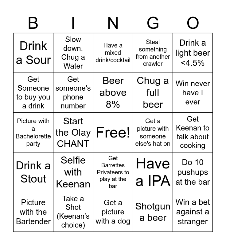 This bingo card has a free space and 24 words: Selfie with Keenan, Take a Shot (Keenan’s choice), Beer above 8%, Picture with the Bartender, Drink a light beer <4.5%, Drink a Sour, Get Someone to buy you a drink, Slow down. Chug a Water, Get a picture with someone else's hat on, Get Barrettes Privateers to play at the bar, Chug a full beer, Picture with a Bachelorette party, Have a IPA, Do 10 pushups at the bar, Get someone's phone number, Shotgun a beer, Get Keenan to talk about cooking, Have a mixed drink/cocktail, Win never have I ever, Start the Olay CHANT, Win a bet against a stranger, Drink a Stout, Steal something from another crawler and Get a picture with a dog.