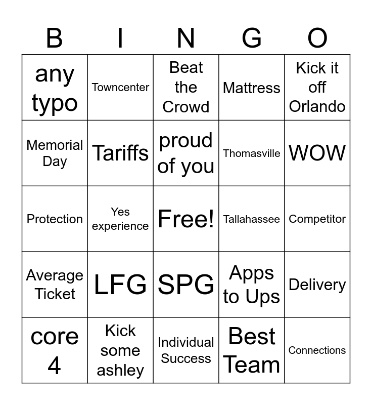 This bingo card has a free space and 24 words: LFG, Kick some ashley, proud of you, core 4, Kick it off Orlando, any typo, Memorial Day, Towncenter, Tallahassee, SPG, Thomasville, Protection, Apps to Ups, Delivery, Tariffs, Best Team, Competitor, Beat the Crowd, WOW, Yes experience, Connections, Average Ticket, Mattress and Individual Success.